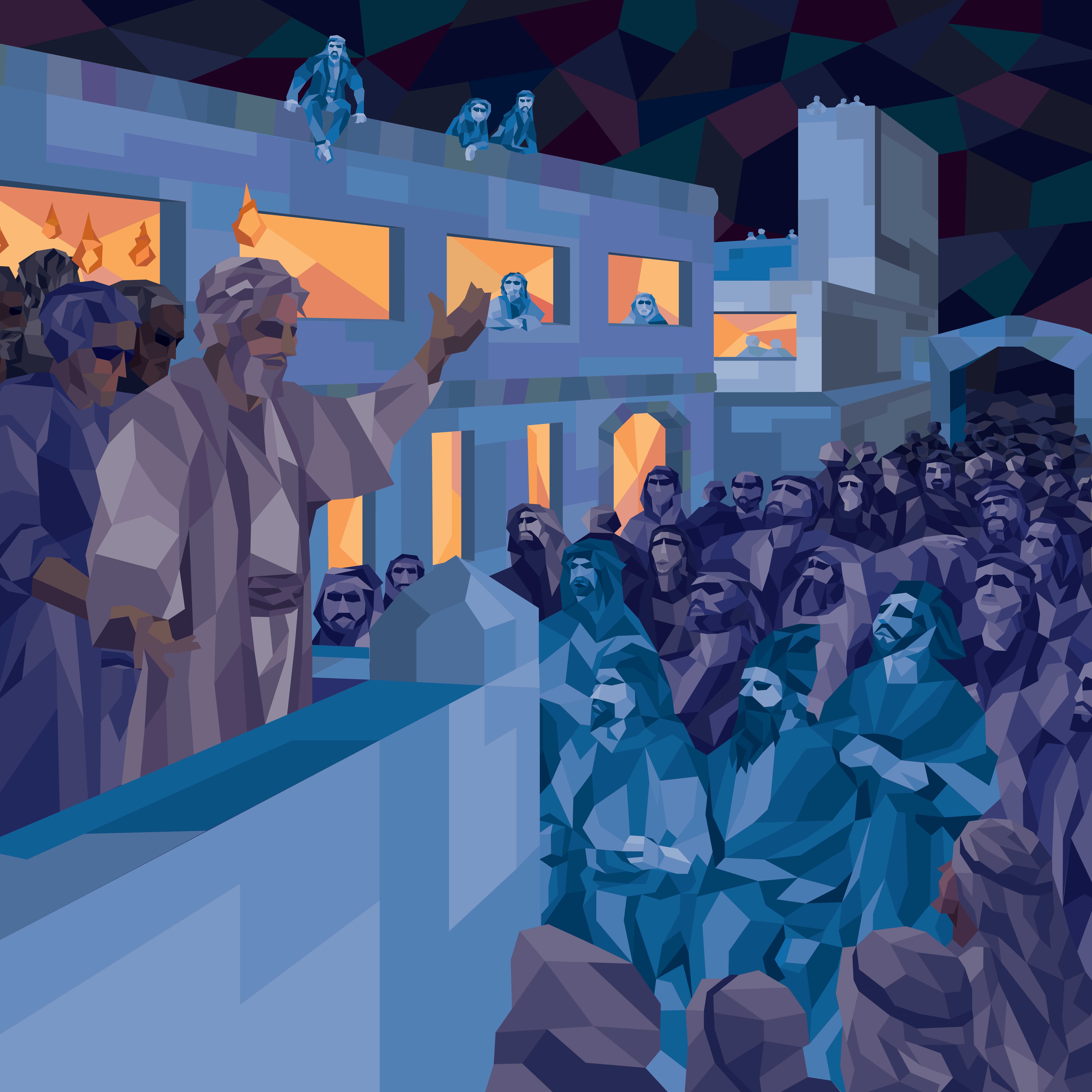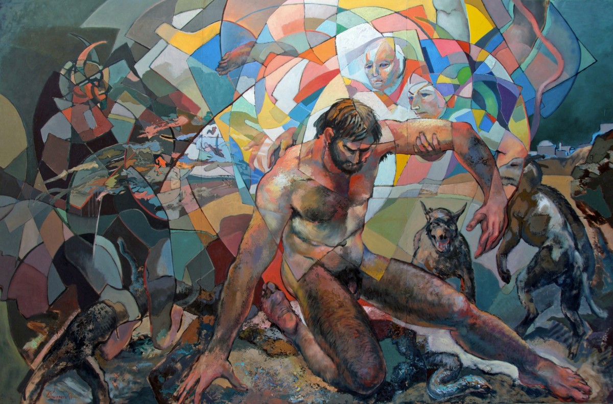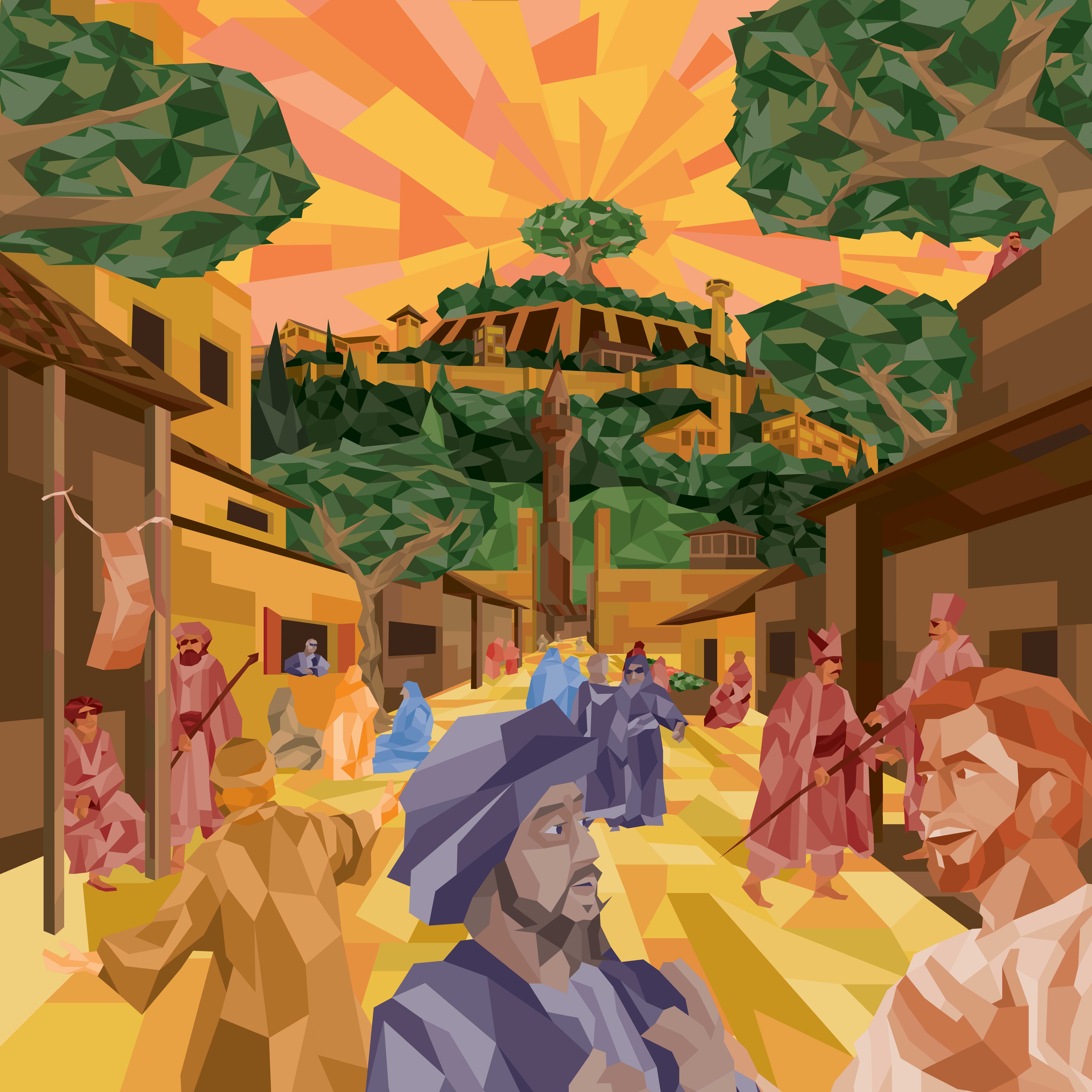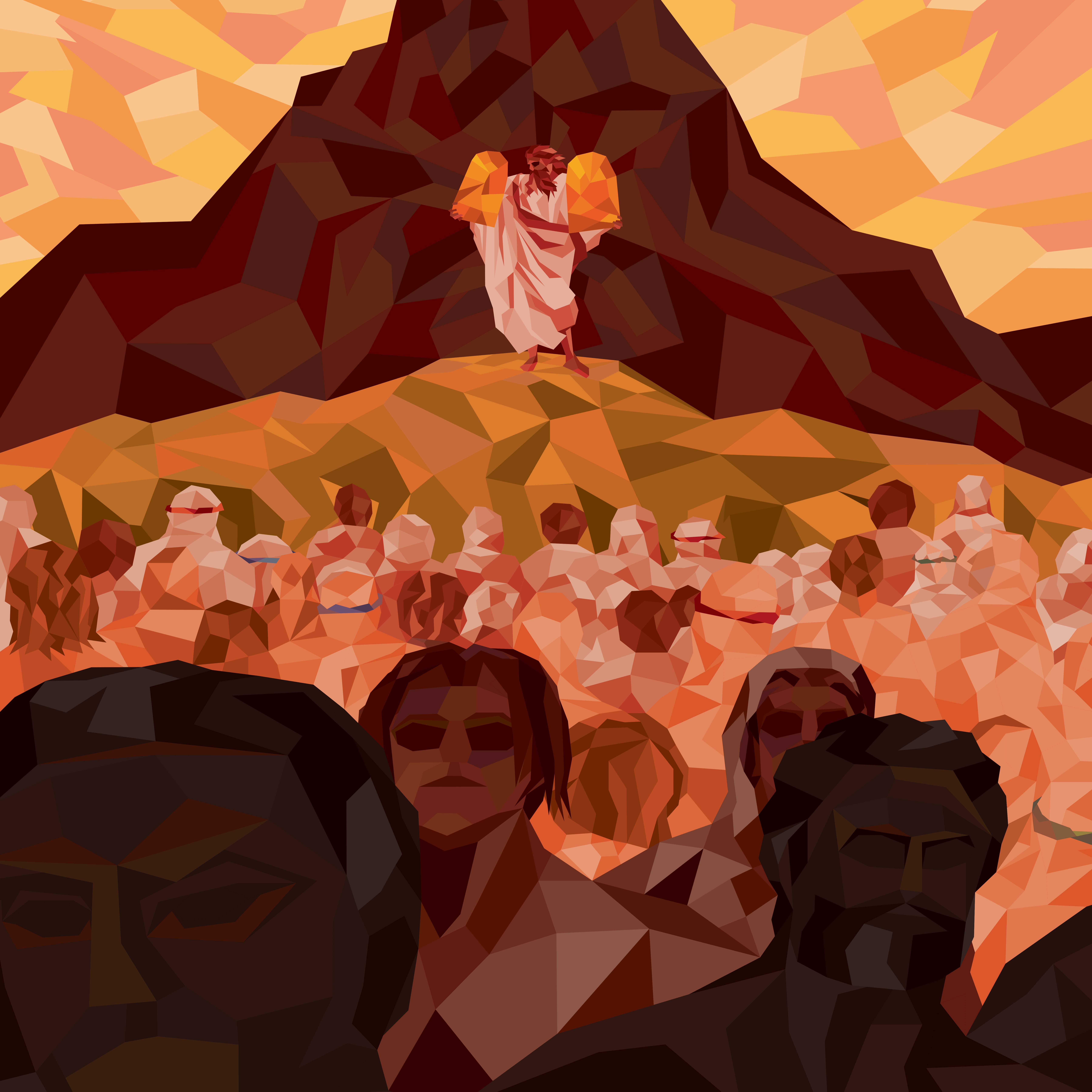 I took inspiration from several different sources. For the Geometric Style and Vivid colors, I looked to artist Charis Tsevis, who uses strong colors and his geometrics style to depict motion, energy and emotion in powerful ways. I also took inspiration from Edward Knippers, a painter who uses his own form of geometric abstraction to visualize the Holy Spirit and God.
